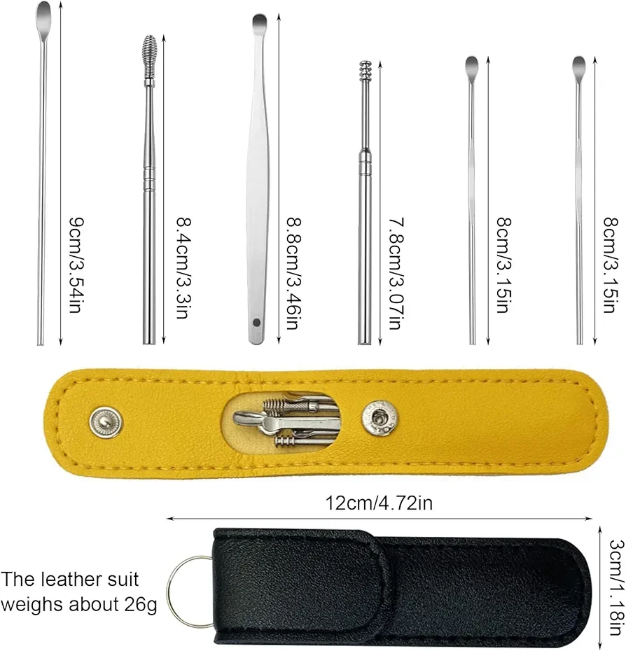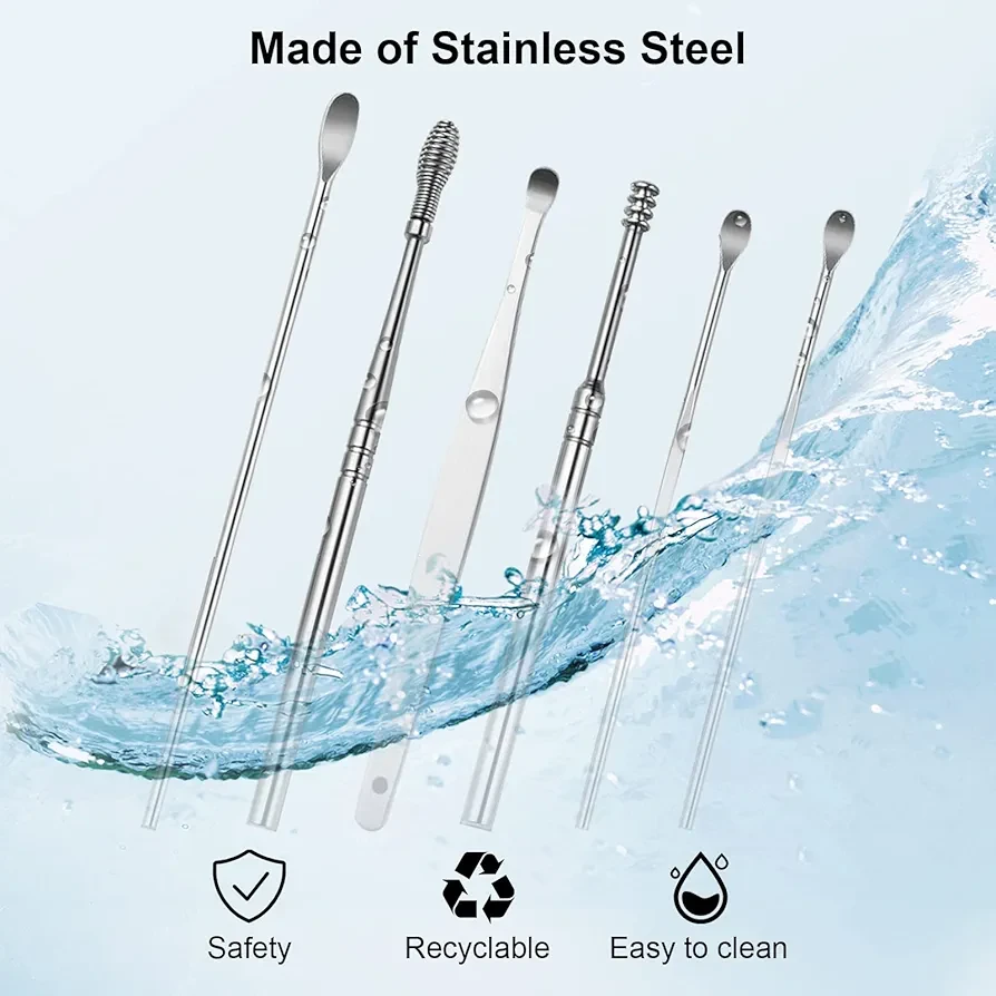This ear wax removal kit has 5 different types ear spoon head, it is suitable for people of all ages. The ladle ear scoop digs deeper. Round head ear scoop is suitable for cleaning small areas or young use. Spring ear digging is more comfortable and can also massage your ear canal. Flat handle ear spoon is suitable for stubborn dirt, easy to hold, not slip, even strength. The circular spiral head is 360 degrees smooth, allowing you to easily remove earwax. |